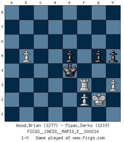 Last move : 1-0 2018 September 19 8:51:56 [Event "FICGS__CHESS__RAPID_E__000214"] [Site "FICGS"] [Date "2018.07.21"] [Round "1"] [White "Wood,Brian"] [Black "Pipac,Darko"] [Result "1-0"] [WhiteElo "1277"] [BlackElo "1219"] 1.Nf3 d5 2.c4 dxc4 3.e4 Nc6 4.Bxc4 Bg4 5.O-O e5 6.Qb3 Qf6 7.Qxb7 Rb8 8.Qxc7 Bxf3 9.Bxf7+ Qxf7 10.Qxc6+ Qd7 11.Qxd7+ Kxd7 12.gxf3 Nf6 13.Nc3 Bb4 14.a3 Bxc3 15.dxc3 Rhd8 16.Rd1+ Ke6 17.Rxd8 Rxd8 18.Bg5 h6 19.Bxf6 Kxf6 20.c4 Rd2 21.b4 Kg5 22.c5 Kf4 23.Kg2 g5 24.c6 Rc2 25.b5 a6 26.a4 h5 27.c7 Rxc7 28.h3 axb5 29.axb5 Rc3 30.Ra6 Rxf3 31.Rf6+ Kxe4 32.Rxf3 1-0 Reti accepted Kingside Castling by player White (move 5) 10 pieces endgame at move 31 : White KRPPP , Black KRPPP WHITE : King + 1 Rook 3 Pawns BLACK : King + 1 Rook 3 Pawns 9 pieces endgame at move 32 : White KRPPP , Black KPPP WHITE : King + 1 Rook 3 Pawns BLACK : King + 3 Pawns Player White won this chess game. Follow this game move after move (download)A sacrifice is best refuted by accepting it. (Wilhelm Steinitz) Über die Verhaftung Bobby Fischers: Warum es die Bush-Administration für nötig befindet einen 61 Jahre alten Mann zu hetzten, der für niemanden ausser sich selbste eine Gefahr darstellt ist ein Rätsel. (Nigel Short) En la vida, como en el Ajedrez, los Peones propios obstruyen nuestro camino. La gran fortuna de un hombre, su comodidad, placer, hijos, libros, que deberían ayudarle a ganar, con mucha frecuencia lo ponen en Jaque Mate. (Charles Buxton) Si rien de grave n'est détecté lors de l'analyse d'une position, on joue alors le coup. Seconde règle de Blumenfeld. Unless I accept my faults I will most certainly doubt my virtues. (Hugh Prather)