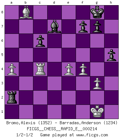 Last move : 1/2-1/2 2018 September 16 21:43:39 [Event "FICGS__CHESS__RAPID_E__000214"] [Site "FICGS"] [Date "2018.07.21"] [Round "1"] [White "Bromo,Alexis"] [Black "Barradas,Anderson"] [Result "1/2-1/2"] [WhiteElo "1352"] [BlackElo "1234"] 1.d4 Nf6 2.c4 d5 3.Nc3 e6 4.Nf3 Nc6 5.e3 Bb4 6.Bd2 O-O 7.c5 Bxc3 8.Bxc3 Ne4 9.Bd3 Ne7 10.Bxe4 dxe4 11.Nd2 b6 12.Nxe4 Bb7 13.f3 Nd5 14.Qd2 Nf6 15.Nxf6+ Qxf6 16.O-O Rfd8 17.Rae1 Rd5 18.e4 Rh5 19.g3 bxc5 20.dxc5 e5 21.f4 Qe7 22.Bxe5 Qxc5+ 23.Bd4 Rd8 24.Bxc5 Rxd2 25.Rd1 R5xh2 26.Rxd2 Rxd2 27.Bxa7 Rxb2 28.Rd1 h6 29.a4 Ra2 30.Rd4 h5 31.Bb8 c6 32.Rb4 Bc8 33.Rc4 Bd7 1/2-1/2 Queen's pawn game Kingside Castling by player Black (move 6) Kingside Castling by player White (move 16) This chess game ended in a draw. Follow this game move after move (download)The defensive power of a pinned piece is only imaginary. (Aaron Nimzovich) Je mehr wir mit Computern analysieren, desto mehr glauben wir an Verteidigung. (Vladimir Kramnik) Bobby Fischer es el mas grande genio de Ajedrez de todos los tiempos. (Alexander Kotov) Les Echecs mettent en conflit, non pas deux intelligences, mais deux volontés. (Lasker) Vladimir Ras-Putin is still alive... He is also a good actor, I saw him in the Lord of the Rings. (Rodolfo d'Ettorre)
