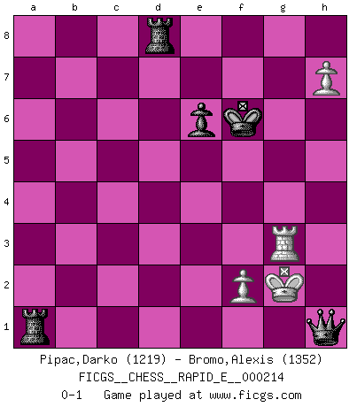 Last move : 0-1 2018 September 24 21:34:7 [Event "FICGS__CHESS__RAPID_E__000214"] [Site "FICGS"] [Date "2018.07.21"] [Round "1"] [White "Pipac,Darko"] [Black "Bromo,Alexis"] [Result "0-1"] [WhiteElo "1219"] [BlackElo "1352"] 1.e4 e5 2.d4 exd4 3.c3 dxc3 4.Bc4 Nc6 5.Nxc3 Bb4 6.Qd3 d6 7.a3 Ne5 8.Qd5 Bxc3+ 9.bxc3 Be6 10.Bg5 Qxg5 11.Qxb7 Rd8 12.Bf1 Bc4 13.Qxc7 Bxf1 14.Kxf1 Ne7 15.Nf3 Nxf3 16.gxf3 Qe5 17.Qxa7 Qxc3 18.Kg2 h5 19.Rac1 Qf6 20.Rc7 Rh6 21.Re1 Rg6+ 22.Kf1 Kf8 23.a4 Qe5 24.Rxe7 Qxe7 25.Qxe7+ Kxe7 26.e5 d5 27.f4 Rg4 28.e6 fxe6 29.Re5 Rxf4 30.Rxh5 Rxa4 31.h4 d4 32.Rh7 Kf7 33.h5 d3 34.h6 Ra1+ 35.Kg2 d2 36.Rxg7+ Kf6 37.Rg3 d1Q 38.h7 Qh1+ 0-1 Danish gambit 10 pieces endgame at move 30 : White KRPP , Black KRRPPP WHITE : King + 1 Rook 2 Pawns BLACK : King + 2 Rooks 3 Pawns 9 pieces endgame at move 36 : White KRPP , Black KRRPP WHITE : King + 1 Rook 2 Pawns BLACK : King + 2 Rooks 2 Pawns Promotion Queen by player Black (move 37) Player Black won this chess game. Follow this game move after move (download)You can only get good at Chess if you love the game. (Bobby Fischer) Als ich elf wurde, wurde ich einfach gut. (Robert James Fischer) Fischer es una tragedia del Ajedrez Americano a la par con Morphy y Pillsbury. (Mig Greengard) Echiquier : carré parfait, comme la Jérusalem nouvelle décrite par l'auteur de l'Apocalypse, huit cases sur huit, exaltation du chiffre 4, symbole du cosmos aux quatre horizons... où le noir et le blanc, l'ombre et la lumière, le mal et le bien s'entremêlent et se conjuguent. (Robert Couffignal, Le Gambit du poète) Drag your thoughts away from your troubles... by the ears, by the heels, or any other way you can manage it. (Mark Twain)