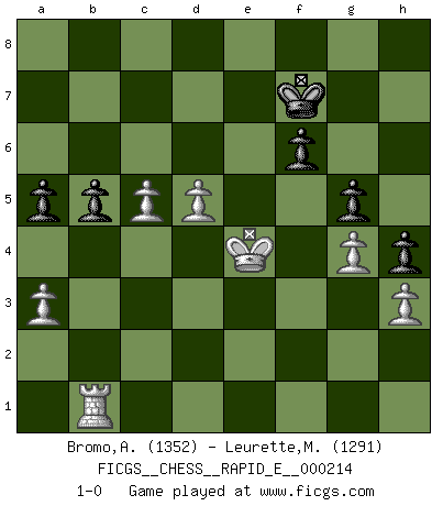 Last move : 1-0 2018 August 5 13:26:37 [Event "FICGS__CHESS__RAPID_E__000214"] [Site "FICGS"] [Date "2018.07.21"] [Round "1"] [White "Bromo,Alexis"] [Black "Leurette,Marc-Antoine"] [Result "1-0"] [WhiteElo "1352"] [BlackElo "1291"] 1.d4 d5 2.c4 e6 3.Nc3 Nf6 4.Nf3 Bb4 5.Bg5 O-O 6.e3 Re8 7.Qc2 Nc6 8.c5 e5 9.a3 Bxc3+ 10.bxc3 e4 11.Bxf6 Qxf6 12.Nd2 a6 13.h3 h5 14.Be2 g6 15.g4 h4 16.c4 Qe6 17.cxd5 Qf6 18.dxc6 Qxc6 19.Bc4 b5 20.Bb3 Be6 21.Bxe6 Rxe6 22.Ke2 Qd5 23.Raf1 c6 24.f4 exf3+ 25.Rxf3 g5 26.Rf5 f6 27.Rxd5 cxd5 28.Rf1 Kg7 29.e4 dxe4 30.Nxe4 Rae8 31.Ke3 Kf7 32.d5 Rxe4+ 33.Qxe4 Rxe4+ 34.Kxe4 a5 35.Rb1 1-0 QGD : Ragozin variation Kingside Castling by player Black (move 5) Player White won this chess game. Follow this game move after move (download)Look at Garry Kasparov. After he loses, invariably he wins the next game. He just kills the next guy. That's something that we have to learn to be able to do. (Maurice Ashley) Deine Wertungszahl - vorausgesetzt einige Jahre schachliche Anstrengung - entspricht etwa dem zehnfachen Deines IQ plus 1000. (Jonathan Levitt) Ayuda a tus piezas para que ellas te puedan ayudar. (Paul Morphy) Le plus grand jeu de l'esprit jamais inventé, plus vous l'apprenez, plus vous y prenez du plaisir. (Garry Kasparov) Games, world of games... There's always an opponent, and there's always a victim. (Revolver, movie)