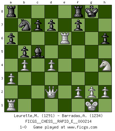 Last move : 1-0 2018 August 18 8:12:5 [Event "FICGS__CHESS__RAPID_E__000214"] [Site "FICGS"] [Date "2018.07.21"] [Round "1"] [White "Leurette,Marc-Antoine"] [Black "Barradas,Anderson"] [Result "1-0"] [WhiteElo "1291"] [BlackElo "1234"] 1.e4 e5 2.Nf3 Nc6 3.Bc4 Bc5 4.c3 a6 5.d4 exd4 6.cxd4 Bb4+ 7.Nc3 b5 8.Bd5 Bb7 9.O-O Nf6 10.Bg5 O-O 11.e5 h6 12.Bxf6 gxf6 13.a3 Ba5 14.b4 Bb6 15.exf6 Qxf6 16.Ne4 Qf5 17.Re1 Nd8 18.Bxb7 Nxb7 19.Qd2 Qg6 20.Nh4 Qe6 21.Nc5 Bxc5 22.Rxe6 1-0 Giuoco Piano Kingside Castling by player White (move 9) Kingside Castling by player Black (move 10) Player White won this chess game. Follow this game move after move (download)Suddenly it was obvious to me in my analysis I had missed what Fischer had found with the greatest of ease at the board. (Mikhail Botvinnik) Intelligenz läßt sich nicht am Weg, sondern nur am Ergebnis feststellen. (Garry Kasparov) El tablero es el mundo, las piezas es el fenomeno del universo, las reglas del juego son lo que llamamos leyes de la naturaleza y el jugador del lado opuesto, se encuentra oculto a nuestra vista. (Thomas Huxley) Dieu déplace le joueur, et celui-ci la pièce. Quel Dieu derrière Dieu commence donc la trame ? Arturo Perez-Reverte (prix de littérature policière 1993). The intuitive mind is a sacred gift; the rational mind is a faithful servant. We have created a society that honors the servant but has forgotten the gift. (Albert Einstein)