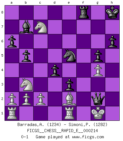 Last move : 0-1 2018 September 15 20:24:50 [Event "FICGS__CHESS__RAPID_E__000214"] [Site "FICGS"] [Date "2018.07.21"] [Round "1"] [White "Barradas,Anderson"] [Black "Simoni,Patucci"] [Result "0-1"] [WhiteElo "1234"] [BlackElo "1282"] 1.e4 d6 2.d4 Nf6 3.Nc3 g6 4.Be2 Bg7 5.Nf3 O-O 6.Bg5 h6 7.Bh4 c6 8.O-O g5 9.Bg3 Nh5 10.e5 Nxg3 11.hxg3 dxe5 12.Nxe5 c5 13.Nb5 a6 14.Na3 cxd4 15.Nf3 Nc6 16.Qd3 e5 17.Rfe1 Kh8 18.Nc4 f5 19.Nfd2 e4 20.Qa3 b5 21.Qc5 Rf6 22.Nb6 Bf8 23.Qxf8+ Rxf8 24.Nxa8 Bb7 25.g4 Ne5 26.f3 e3 27.Nb3 fxg4 28.fxg4 Qd5 29.Nc7 Qxg2+ 0-1 Pirc defense Kingside Castling by player Black (move 5) Kingside Castling by player White (move 8) Player Black won this chess game. Follow this game move after move (download)Every Chess master was once a beginner. (Chernev) Ein Gewinn durch eine ungenaue Kombination, sei sie auch noch so vorzeigbar, erfüllt mich mit Schaudern. (Wilhelm Steinitz) Solo los afeminados hacen el Enroque. (Rob Sillars) Celui qui prend des risques peut perdre, celui qui n'en prend pas perd toujours. (Xavier Tartacover) A good aphorism is too hard for the tooth of time, and is not worn away with the centuries, although it serves as food for every speech. (Friedrich Nietzsche)