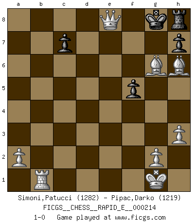 Last move : 1-0 2018 September 8 12:27:11 [Event "FICGS__CHESS__RAPID_E__000214"] [Site "FICGS"] [Date "2018.07.21"] [Round "1"] [White "Simoni,Patucci"] [Black "Pipac,Darko"] [Result "1-0"] [WhiteElo "1282"] [BlackElo "1219"] 1.e4 e5 2.Nc3 a6 3.f4 exf4 4.Nf3 Nc6 5.d4 Bb4 6.Bd3 d5 7.O-O Bxc3 8.bxc3 Bg4 9.exd5 Qxd5 10.Bxf4 Rc8 11.c4 Bxf3 12.cxd5 Bxd1 13.dxc6 Bg4 14.h3 Be6 15.cxb7 Rb8 16.Bxa6 Kd7 17.d5 Bxd5 18.Rad1 Ne7 19.c4 Kc6 20.cxd5+ Nxd5 21.Rb1 g6 22.Rfc1+ Kd7 23.Bb5+ Ke7 24.Re1+ Kf8 25.Bh6+ Kg8 26.Re8+ Rxe8 27.Bxe8 f5 28.b8Q Nf6 29.Bxg6 Ne8 30.Qxe8+ 1-0 Vienna game Kingside Castling by player White (move 7) Promotion Queen by player White (move 28) Player White won this chess game. Follow this game move after move (download)Best by test: 1. e4 (Bobby Fischer) Alles was am Schachbrett zählt sind gute Züge. (Robert James Fischer) Un juego de Ajedrez es un dialogo, una conversación entre un jugador y su oponente. Cada movimiento del oponente puede contener amenazas o tropiezos, pero un jugador no se puede defender de las amenazas o tomar ventaja de los tropiezos si es que no se pregunta a sí mismo: ¿Que es lo que mi oponente va a hacer después de cada movida?. (Bruce A. Moon) C'est la seule position que je connaisse où les deux camps sont mals. Propos prêtés à V. Anand. Statistics can be made to prove anything - even the truth. (Author unknown)