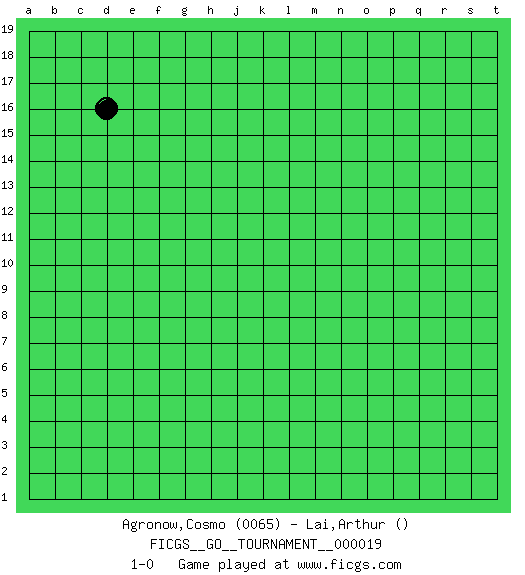 Last move : 1-0 2018 August 21 22:53:22 [Event "FICGS__GO__TOURNAMENT__000019"] [Site "FICGS"] [Date "2018.07.22"] [Round "1"] [Black "Agronow,Cosmo"] [White "Lai,Arthur"] [Result "1-0"] [Rating 1 "0065"] 1.d16 1-0 This go game has been lost on time (started : 2018.07.22 3:57:44) Here are the names of the openings (joseki) played in the four corners : Player Black won this Go (weiqi, baduk) game. Follow this game move after move (download)A basic: Don't push too hard. (Jansteen) Thus, what is of supreme importance in war is to attack the enemy's strategy. (Sun Tzu)