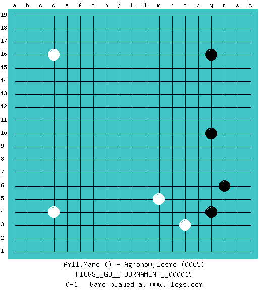 Last move : 0-1 2018 August 25 22:57:45 [Event "FICGS__GO__TOURNAMENT__000019"] [Site "FICGS"] [Date "2018.07.22"] [Round "1"] [Black "Amil,Marc"] [White "Agronow,Cosmo"] [Result "0-1"] [Rating 2 "0065"] 1.q4 d16 2.q16 d4 3.q10 o3 4.r6 m5 0-1 This go game has been lost on time (started : 2018.07.22 3:57:44) Here are the names of the openings (joseki) played in the four corners : Corner q4 : q4 o3 Hoshi (Hwajeom, Seongjeom, Xingwei`) 4-4 Point. The star or hoshi (4-4) point, emphasizing influence at the potential expense of territory. Ikken Kakari (Hankan Keolch'im, Yi Gua`jiao~, 1-Space Low Approach). White 2 is the standard approach move to the 4-4. Player White won this Go (weiqi, baduk) game. Follow this game move after move (download)Don't get surrounded ! Ever ! (Anonymous) If we knew what we were doing, we would not call it research. (Albert Einstein)