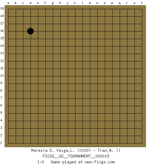Last move : 1-0 2018 August 21 22:53:22 [Event "FICGS__GO__TOURNAMENT__000019"] [Site "FICGS"] [Date "2018.07.22"] [Round "1"] [Black "Moreira D. Veiga,Ludovic"] [White "Tran,Nghia"] [Result "1-0"] [Rating 1 "0100"] 1.d16 1-0 This go game has been lost on time (started : 2018.07.22 3:57:44) Here are the names of the openings (joseki) played in the four corners : Player Black won this Go (weiqi, baduk) game. Follow this game move after move (download)Good moves and bad moves are bedfellows. (Anonymous) If only people were all showed a certain minimum level of niceness; if only people didn't retract verbal draw offers (without draw box ticked) on ficgs; if only people didn't kill; if only people didn't run concentration / extermination camps, if only people didn't drop nuclear bombs on Hiroshima and Nagasaki, and so on - it would be a much more beautiful world. But sadly, things are not so... (Normajean Yates)