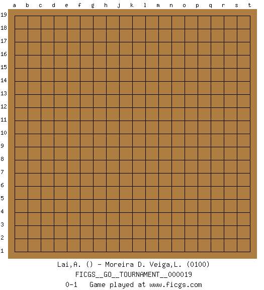 Last move : 0-1 2018 August 21 10:53:51 [Event "FICGS__GO__TOURNAMENT__000019"] [Site "FICGS"] [Date "2018.07.22"] [Round "1"] [Black "Lai,Arthur"] [White "Moreira D. Veiga,Ludovic"] [Result "0-1"] [Rating 2 "0100"] 0-1 This go game has been lost on time (started : 2018.07.22 3:57:44) Here are the names of the openings (joseki) played in the four corners : Player White won this Go (weiqi, baduk) game. Follow this game move after move (download)If you have lost four corners, resign. (Anonymous) The smarter you play, the luckier you'll be. (Mark Pilarski)
