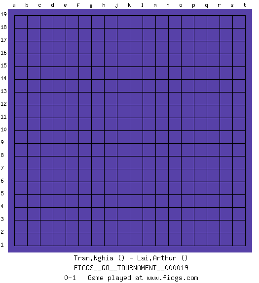 Last move : 0-1 2018 August 21 10:53:51 [Event "FICGS__GO__TOURNAMENT__000019"] [Site "FICGS"] [Date "2018.07.22"] [Round "1"] [Black "Tran,Nghia"] [White "Lai,Arthur"] [Result "0-1"] 0-1 This go game has been lost on time (started : 2018.07.22 3:57:44) Here are the names of the openings (joseki) played in the four corners : Player White won this Go (weiqi, baduk) game. Follow this game move after move (download)At the head of two stones in a row, play hane. (Anonymous) No, I am still playing. (Anatoly Karpov)