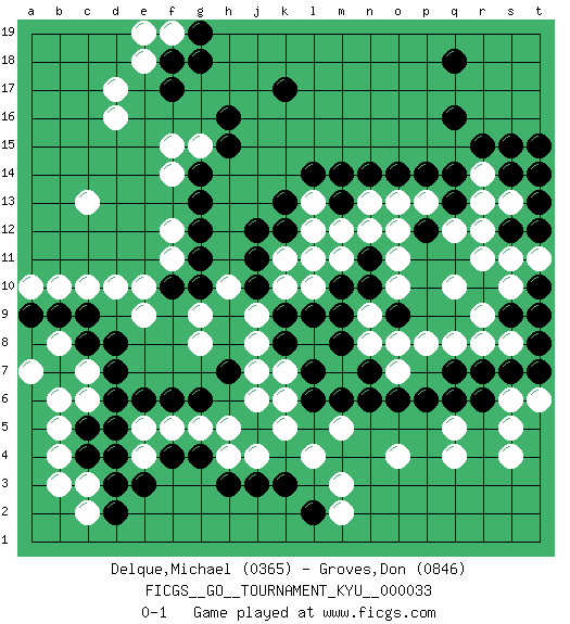 Last move : 0-1 2007 October 10 19:14:22 [Event "FICGS__GO__TOURNAMENT_KYU__000033"] [Site "FICGS"] [Date "2007.05.15"] [Round "1"] [Black "Delque,Michael"] [White "Groves,Don"] [Result "0-1"] [Rating 1 "0365"] [Rating 2 "0846"] 1.d4 q4 2.q16 d16 3.k3 d10 4.k17 r11 5.f17 c13 6.c8 m3 7.r6 r14 8.r15 r8 9.p6 o4 10.n6 s4 11.q14 r13 12.l14 d17 13.g4 c6 14.d7 c3 15.c4 b4 16.d3 b3 17.c5 b5 18.d6 c7 19.d8 c10 20.g10 f15 21.n10 l4 22.l6 k5 23.s15 j6 24.h16 e9 25.g14 f14 26.g13 f12 27.g12 f11 28.f10 e10 29.g11 p8 30.m8 j4 31.j3 h4 32.h3 g5 33.f4 j8 34.k9 j9 35.j10 p13 36.p14 o13 37.o14 n13 38.n14 o11 39.q13 q12 40.q18 l13 41.k13 l12 42.j12 l10 43.l9 k10 44.m10 m11 45.k8 k7 46.l7 n8 47.n7 n9 48.m9 o10 49.l2 m2 50.d2 b8 51.b7 b6 52.b9 a7 53.c9 b10 54.t12 t14 55.s14 s13 56.t13 t11 57.s12 r12 58.t15 s11 59.t14 e18 60.f18 f19 61.g19 e19 62.g18 g8 63.q7 q8 64.s7 q5 65.q6 s5 66.t9 s6 67.r7 s8 68.t8 t6 69.t7 m5 70.m6 o7 71.o6 h10 72.j11 g15 73.h15 c2 74.g6 f5 75.f6 e5 76.e6 e4 77.e3 h5 78.d5 k6 79.l11 k11 80.k12 l11 81.n11 n12 82.m13 m12 83.m14 g9 84.p12 o12 85.r10 s10 86.o9 o8 87.s9 r9 88.t10 q10 89.h7 j7 90.a9 a10 0-1 Here are the names of the openings (joseki) played in the four corners : Corner q16 : q16 r11 Hoshi (Hwajeom, Seongjeom, Xingwei`) 4-4 Point. The star or hoshi (4-4) point, emphasizing influence at the potential expense of territory. Corner d16 : d16 f17 Hoshi (Hwajeom, Seongjeom, Xingwei`) 4-4 Point. The star or hoshi (4-4) point, emphasizing influence at the potential expense of territory. Ikken Kakari (Hankan Keolch'im, Yi Gua`jiao~, 1-Space Low Approach). Black 2 is the standard approach move to the 4-4. Player White won this Go (weiqi, baduk) game. Follow this game move after move (download)The comb formation is alive. (Anonymous) CHESS, n. f. [echecs, Fr.] A nice and abstruse game, in which two sets of puppets are moved in opposition to each other. (Dr Samuel Johnson, A Dictionary Of The English Language, 1755)