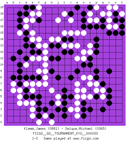 Last move : 1-0 2007 July 29 19:17:41 [Event "FICGS__GO__TOURNAMENT_KYU__000033"] [Site "FICGS"] [Date "2007.05.15"] [Round "1"] [Black "Klemm,James"] [White "Delque,Michael"] [Result "1-0"] [Rating 1 "0881"] [Rating 2 "0365"] 1.q16 d16 2.q3 d4 3.r9 d10 4.f17 j17 5.c17 d17 6.d18 e18 7.c18 e17 8.c16 c15 9.d15 e15 10.d14 e14 11.d13 j14 12.f3 e3 13.f4 d7 14.k4 o17 15.o16 p17 16.p16 r17 17.q17 q18 18.n17 r16 19.r15 q5 20.s15 o18 21.n18 p19 22.q7 o5 23.o3 m4 24.n7 m6 25.c12 c11 26.l8 n15 27.n16 m15 28.k6 m2 29.r4 p7 30.p8 o7 31.p9 o8 32.n10 n8 33.m9 m7 34.r5 q6 35.r6 n6 36.c7 c6 37.d6 e6 38.d5 c5 39.e5 e4 40.f5 c4 41.d8 e7 42.e8 f7 43.f8 g7 44.c9 g8 45.j8 g10 46.c10 f9 47.e13 e11 48.b11 b7 49.c8 f13 50.f12 f14 51.j11 g12 52.e12 f11 53.l14 l15 54.k14 k15 55.j13 h14 56.p14 n12 57.o11 o12 58.p12 o13 59.p13 k13 60.k12 l13 61.l12 m13 62.s18 r18 63.s17 r19 64.l18 k18 65.h9 g9 66.k2 s16 67.t16 j5 68.k5 h6 69.h4 j4 70.j3 e2 71.n2 l3 72.k3 h1 73.e19 f19 74.d19 f18 75.b8 b6 76.d11 l17 77.n3 m3 78.f2 f1 79.h11 g11 80.m19 n11 81.o10 m11 82.o19 n19 83.h13 g13 84.o19 s19 85.t15 n19 86.n4 n5 87.o19 t18 88.t17 n19 89.p5 p6 90.o19 h3 91.h2 n19 92.l5 m5 93.o19 g2 94.g3 1-0 Here are the names of the openings (joseki) played in the four corners : Corner d16 : d16 f17 Hoshi (Hwajeom, Seongjeom, Xingwei`) 4-4 Point. The star or hoshi (4-4) point, emphasizing influence at the potential expense of territory. Ikken Kakari (Hankan Keolch'im, Yi Gua`jiao~, 1-Space Low Approach). Black 2 is the standard approach move to the 4-4. Corner d4 : d4 f3 Hoshi (Hwajeom, Seongjeom, Xingwei`) 4-4 Point. The star or hoshi (4-4) point, emphasizing influence at the potential expense of territory. Ikken Kakari (Hankan Keolch'im, Yi Gua`jiao~, 1-Space Low Approach). Black 2 is the standard approach move to the 4-4. Corner q16 : q16 o17 Hoshi (Hwajeom, Seongjeom, Xingwei`) 4-4 Point. The star or hoshi (4-4) point, emphasizing influence at the potential expense of territory. Ikken Kakari (Hankan Keolch'im, Yi Gua`jiao~, 1-Space Low Approach). White 2 is the standard approach move to the 4-4. Player Black won this Go (weiqi, baduk) game. Follow this game move after move (download)Big groups never die. (Anonymous) Chess is as much a mystery as women. (Purdy)