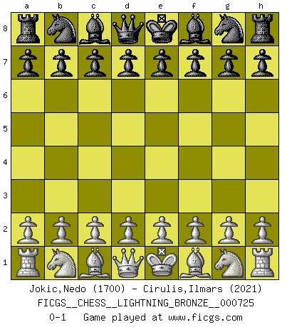 Last move : 0-1 2018 July 22 19:38:50 [Event "FICGS__CHESS__LIGHTNING_BRONZE__000725"] [Site "FICGS"] [Date "2018.07.22"] [Round "1"] [White "Jokic,Nedo"] [Black "Cirulis,Ilmars"] [Result "0-1"] [WhiteElo "1700"] [BlackElo "2021"] 0-1 This chess game has been lost on time (started : 2018.07.22 14:36:22) Player Black won this chess game. Follow this game move after move (download)Excellence at Chess is one mark of a scheming mind. (Sir Arthur Conan Doyle) Wenn Du nicht kämpfst, um anderen etwas zu beweisen, sondern nur für Dich selbst, dann bist du fast unbesiegbar. (Garry Kasparov) De eso se trata el Ajedrez. Un día le das una lección a tu oponente y al día siguiente el te da una a tí. (Bobby Fischer) Avec des compensations pour le matériel en plus... (Anonyme) What doesn't kill us makes us stronger. (Friedrich Nietzsche)