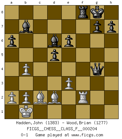 Last move : 0-1 2018 October 3 13:23:28 [Event "FICGS__CHESS__CLASS_F__000204"] [Site "FICGS"] [Date "2018.07.23"] [Round "1"] [White "Hadden,John"] [Black "Wood,Brian"] [Result "0-1"] [WhiteElo "1383"] [BlackElo "1277"] 1.d4 f5 2.Nc3 Nf6 3.Nf3 e6 4.e3 Be7 5.Bd2 O-O 6.Bc4 d5 7.Bb3 c5 8.dxc5 Bxc5 9.Qe2 Nc6 10.O-O-O Qe8 11.Kb1 a6 12.h3 b5 13.Qd3 Ne4 14.Nxe4 fxe4 15.Qc3 Qe7 16.Bc1 b4 17.Qe1 exf3 18.gxf3 Rxf3 19.Rd3 Ne5 20.Rd1 Bb7 21.Rg1 Rxh3 22.c3 Nf3 23.Qe2 Nxg1 24.Rxg1 Qf6 25.Qg4 Rf3 26.Rg2 Rf8 27.cxb4 Bd6 28.Bd2 Rxf2 29.Rxf2 Qg6+ 30.Bc2 Qxg4 0-1 Dutch Kingside Castling by player Black (move 5) Queenside Castling by player White (move 10) Player Black won this chess game. Follow this game move after move (download)Many Chess players were surprised when after the game, Fischer quietly explained: 'I had already analyzed this possibility' in a position which I thought was not possible to foresee from the opening. (Mikhail Tal) Kleine Schachspieler machen Mist, und große Schachspieler machen Mist, aber große machen weniger Mist. (Fritz Sämisch) El Ajedrez es el juego mas altamente simbólico, pero las agresiones estan por lo tanto aún mas francamente representadas en la partida. Tal vez comenzo como un juego de guerra; Algo como la representación de una batalla en miniatura entre las fuerzas de dos reinos. (Karl Meninger) Le jeu d'échecs est comme rejeté hors du temps. (Antoine de Saint-Exupéry) Dave, my mind is going. I can feel it. (HAL 9000 in 2001, a space odyssey)