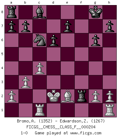 Last move : 1-0 2018 December 21 2:14:39 [Event "FICGS__CHESS__CLASS_F__000204"] [Site "FICGS"] [Date "2018.07.23"] [Round "1"] [White "Bromo,Alexis"] [Black "Edwardson,Zachariah"] [Result "1-0"] [WhiteElo "1352"] [BlackElo "1267"] 1.d4 f5 2.c4 Nf6 3.Nc3 g6 4.Nf3 Bg7 5.Bg5 c5 6.e3 Ne4 7.Nxe4 fxe4 8.Nd2 Qa5 9.b3 cxd4 10.exd4 Qxg5 11.Nxe4 Qa5+ 12.Qd2 Qxd2+ 13.Nxd2 Bxd4 14.Rd1 O-O 15.Nf3 Bc3+ 16.Nd2 d6 17.Bd3 Nc6 18.Rc1 Bxd2+ 19.Kxd2 Rxf2+ 20.Be2 1-0 This chess game has been lost on time (started : 2018.07.23 20:13:27) Dutch with c4 & Nc3 Kingside Castling by player Black (move 14) Player White won this chess game. Follow this game move after move (download)Chess is above all, a fight ! (Emanuel Lasker) Ich verlor meine Bürgerrechte, mein Gehalt wurde mir nicht mehr bezahlt und ich wurde zensiert und durfte nicht mehr ins Ausland reisen. [nach dem Match Fischer-Taimanov 6:0] (Mark Taimanov) Me gusta decir que Bobby Fischer fue el mejor jugador que jamás haya existido. Pero lo que hizo de Fischer un genio, fue su habilidad de mezclar una frescura y pragmatismo Americano con ideas Rusas acerca de la estrategia. (Bruce Pandolfini) Celui qui prend des risques peut perdre, celui qui n'en prend pas perd toujours. (Xavier Tartacover) There are two kinds of people in the world, my friend. Those who have a loaded gun and those who dig. You dig ! (Blondie in The Good, The Bad and The Ugly)