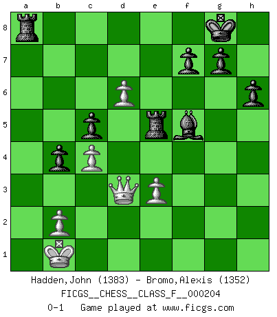 Last move : 0-1 2018 September 24 22:28:52 [Event "FICGS__CHESS__CLASS_F__000204"] [Site "FICGS"] [Date "2018.07.23"] [Round "1"] [White "Hadden,John"] [Black "Bromo,Alexis"] [Result "0-1"] [WhiteElo "1383"] [BlackElo "1352"] 1.d4 d5 2.Nc3 Nf6 3.Nf3 Nc6 4.Bg5 e6 5.e3 Be7 6.Bd3 h6 7.Bxf6 Bxf6 8.Qd2 O-O 9.O-O-O e5 10.Kb1 e4 11.Bxe4 dxe4 12.Nxe4 Re8 13.Nxf6+ Qxf6 14.h3 a5 15.a3 b5 16.Qd3 Ba6 17.d5 b4 18.Qb3 Ne5 19.Nxe5 Rxe5 20.Rd4 Qxf2 21.Rf4 Qxg2 22.Rhf1 Qxf1+ 23.Rxf1 Bxf1 24.axb4 axb4 25.d6 c5 26.c4 Bxh3 27.Qd3 Bf5 0-1 Queen's pawn : Chigorin variation Kingside Castling by player Black (move 8) Queenside Castling by player White (move 9) Player Black won this chess game. Follow this game move after move (download)A player surprised is half beaten. (Proverb) Kann Schach nicht schließlich das Nationalspiel der Deutschen werden? Und welche weiteren Ausblicke bieten sich dann dar! Welche Hebung des allgemeinen Kultur-Niveaus, ja der Moral, wenn das Schachbrett den Kartentisch verdrängen würde! Wahrlich, ein Ziel, des Schweißes der Edlen wert! (Siegbert Tarrasch) ¿Que sería del Ajedrez sin errores graciosos?. (Kurt Richter) On entre au jeu d'Echecs comme on entre en Religion. Pour le joueur d'Echecs, la partie d'Echecs c'est l'office, la messe, le défilé du 1er Mai, le dépôt de gerbe au Monument aux Morts. C'est un drame sacré. (Michel Roos) If computers get too powerful, we can organize them into committees. That'll do them in. (Anonymous)