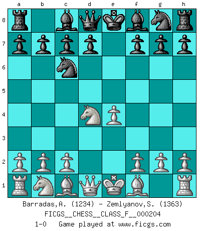 Last move : 1-0 2018 September 5 11:45:14 [Event "FICGS__CHESS__CLASS_F__000204"] [Site "FICGS"] [Date "2018.07.23"] [Round "1"] [White "Barradas,Anderson"] [Black "Zemlyanov,Sergey"] [Result "1-0"] [WhiteElo "1234"] [BlackElo "1363"] 1.e4 e5 2.Nf3 Nc6 3.d4 exd4 4.Nxd4 1-0 This chess game has been lost on time (started : 2018.07.23 20:13:27) Scotch game Player White won this chess game. Follow this game move after move (download)Chess is a sea in which a gnat may drink and an elephant may bathe. (Hindu proverb) Ich weiss nicht was Gott gegen mich auf 1.e4 antworten würde. (Robert James Fischer) El Ajedrez es despiadado: debes de estar preparado para matar gente. (Nigel Short) Si le désir cupide (et stupide) de gagner est une inépuisable source de souffrance, une combinaison brillante sur l'échiquier est une découverte : le coquelicot qui s'épanouit lorsque apparaît la Voie Lactée. (Arrabal) History is a gallery of pictures in which there are few originals and many copies. (Alexis de Tocqueville)