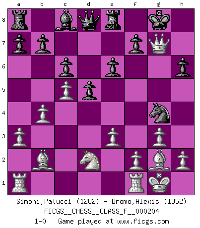 Last move : 1-0 2018 September 24 13:48:39 [Event "FICGS__CHESS__CLASS_F__000204"] [Site "FICGS"] [Date "2018.07.23"] [Round "1"] [White "Simoni,Patucci"] [Black "Bromo,Alexis"] [Result "1-0"] [WhiteElo "1282"] [BlackElo "1352"] 1.Nf3 d5 2.c4 e6 3.g3 Nf6 4.Bg2 Nc6 5.O-O Bc5 6.d4 Bb6 7.c5 Ba5 8.a3 Nxd4 9.Qxd4 c6 10.b4 Bc7 11.Bb2 O-O 12.Nbd2 Re8 13.Ne5 Bxe5 14.Qxe5 h6 15.e3 Ng4 16.Qxg7+ 1-0 Reti Opening Kingside Castling by player White (move 5) Kingside Castling by player Black (move 11) Player White won this chess game. Follow this game move after move (download)When you don't know what to do, wait for your opponent to get an idea - it's sure to be wrong. (Tarrasch) Wenn ich mich einlogge, glauben die Leute gewöhnlich nicht, dass ich es selbst bin und sie fangen an, mir dumme Fragen zu stellen. Und wenn sie es glauben, stellen sie wieder andere dumme Fragen. (Judith Polgar) Creo que una cierta cantidad de temperamento es esperada de los genios del Ajedrez. (Ron Gross) Shah mat. Le roi est mort. Cri de fierté d'un joueur venant de terrasser son adversaire, courtoisement, sans effusion de sang. I feel so... helpless. (C-3PO in Star Wars ep.3)