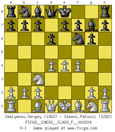 Last move : 0-1 2018 October 3 18:32:0 [Event "FICGS__CHESS__CLASS_F__000204"] [Site "FICGS"] [Date "2018.07.23"] [Round "1"] [White "Zemlyanov,Sergey"] [Black "Simoni,Patucci"] [Result "0-1"] [WhiteElo "1363"] [BlackElo "1282"] 1.e4 d6 2.d4 Nf6 3.Nc3 g6 4.f4 Bg7 0-1 This chess game has been lost on time (started : 2018.07.23 20:13:27) Pirc : Austrian attack Player Black won this chess game. Follow this game move after move (download)Morphy was probably the greatest genius of them all. (Bobby Fischer) Das Schachspiel übertrifft alle anderen Spiele so weit wie der Chimborasso einen Misthaufen. (Arthur Schopenhauer) Tu sabes, camarada Pachman, no disfruto el ser un Ministro, preferería jugar al Ajedrez como tu. (Che Guevara) La vie est comme un jeu d'échecs : nous esquissons un plan, mais celui-ci est tributaire de ce que daignent faire l'adversaire aux échecs et le destin dans la vie. (Arthur Schopenhauer) Life doesn't imitate art, it imitates bad television. (Woody Allen)