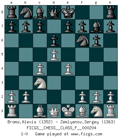 Last move : 1-0 2018 September 15 13:6:30 [Event "FICGS__CHESS__CLASS_F__000204"] [Site "FICGS"] [Date "2018.07.23"] [Round "1"] [White "Bromo,Alexis"] [Black "Zemlyanov,Sergey"] [Result "1-0"] [WhiteElo "1352"] [BlackElo "1363"] 1.d4 Nf6 2.c4 g6 3.Nc3 Bg7 4.e4 d6 5.d5 1-0 This chess game has been lost on time (started : 2018.07.23 20:13:27) King's Indian : 4.e4 Player White won this chess game. Follow this game move after move (download)A passed Pawn increases in strength as the number of pieces on the board diminishes. (Capablanca) Ich bin stolz ein Bulgare zu sein. (Veselin Topalov) Uno no tiene que jugar muy bien, es suficiente jugar mejor que el oponente. (Siegbert Tarrasch) Aucun coup ne doit être joué sans but. (Pedro Damiano) The beginning is the most important part of the work. (Plato)