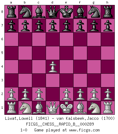 Last move : 1-0 2018 August 24 22:55:15 [Event "FICGS__CHESS__RAPID_B__000289"] [Site "FICGS"] [Date "2018.07.25"] [Round "1"] [White "Liwat,Lowell"] [Black "van Kalsbeek,Jacco"] [Result "1-0"] [WhiteElo "1841"] [BlackElo "1700"] 1.d4 1-0 This chess game has been lost on time (started : 2018.07.25 11:59:30) Queen's pawn Player White won this chess game. Follow this game move after move (download)When asked, -How is that you pick better moves than your opponents?, I responded: I'm very glad you asked me that, because, as it happens, there is a very simple answer. I think up my own moves, and I make my opponent think up his. (Alexander Alekhine) Schach ist gnadenlos. Du mußt bereit sein zu töten. (Nigel Short) Un jugador que es sorprendido, esta derrotado a medias. (Proverbio) Le jeu d'échecs est comme rejeté hors du temps. (Antoine de Saint-Exupéry) For to win one hundred victories in one hundred battles is not the acme of skill. To subdue the enemy without fighting is the acme of skill. (Sun Tzu)