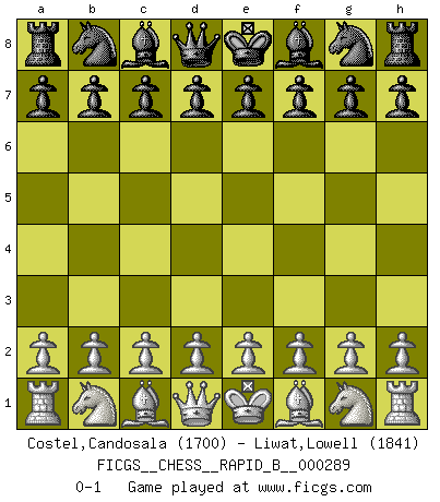 Last move : 0-1 2018 August 24 22:55:15 [Event "FICGS__CHESS__RAPID_B__000289"] [Site "FICGS"] [Date "2018.07.25"] [Round "1"] [White "Costel,Candosala"] [Black "Liwat,Lowell"] [Result "0-1"] [WhiteElo "1700"] [BlackElo "1841"] 0-1 This chess game has been lost on time (started : 2018.07.25 11:59:30) Player Black won this chess game. Follow this game move after move (download)For surely of all the drugs in the world, Chess must be the most permanently pleasurable. (Assiac) Schach wird sich dank seiner hohen kulturellen Tradition immer durchsetzen. In näherer Zukunft womöglich sogar als Gegenreaktion auf die maßlose Reizüberflutung im Freizeit- und Spielbereich. (Garry Kasparov) Tu puedes aprender mucho mas de una partida que pierdas que de una partida ganada. Tendras que perder cientos de partidas antes de llegar a ser un buen jugador. (Jose Raul Capablanca) Les erreurs sont comme les malheurs, elles n'arrivent jamais seules. (Siegbert Tarrasch) They misunderestimated me. (George W. Bush, Bentonville nov. 6, 2000)