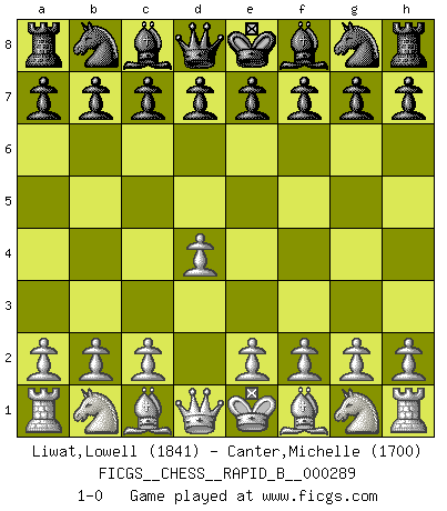 Last move : 1-0 2018 August 24 22:55:15 [Event "FICGS__CHESS__RAPID_B__000289"] [Site "FICGS"] [Date "2018.07.25"] [Round "1"] [White "Liwat,Lowell"] [Black "Canter,Michelle"] [Result "1-0"] [WhiteElo "1841"] [BlackElo "1700"] 1.d4 1-0 This chess game has been lost on time (started : 2018.07.25 11:59:30) Queen's pawn Player White won this chess game. Follow this game move after move (download)First-class players lose to second class players because second-class players sometimes play a first-class game. (Tarrasch) Ich bin Weltmeister und muß mit niemandem irgend etwas diskutieren. (Viswanathan Anand) Te sientas frente a un tablero y repentinamente tu corazón brinca. Tu mano tiembla al tomar una pieza y moverla. Pero lo que el Ajedrez te enseña es que tu debes permanecer ahí con calma y pensar de que si realmente es una buena idea o de que si hay otras ideas mejores. (Stanley Kubrick) Les ravages du H expliquent la différence de niveau entre Tal et Thal [Abergel]. Wikichess, chess moves explained by 'experimented' players. (Thibault de Vassal)
