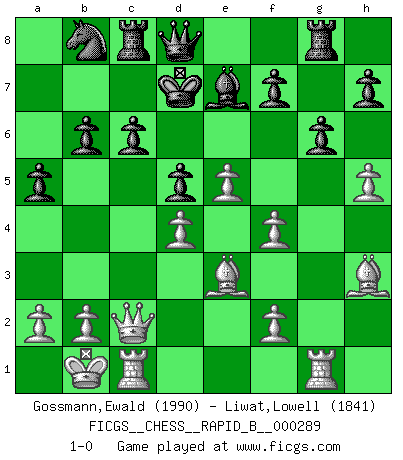 Last move : 1-0 2018 July 31 14:35:29 [Event "FICGS__CHESS__RAPID_B__000289"] [Site "FICGS"] [Date "2018.07.25"] [Round "1"] [White "Gossmann,Ewald"] [Black "Liwat,Lowell"] [Result "1-0"] [WhiteElo "1990"] [BlackElo "1841"] 1.e4 c6 2.d4 Nf6 3.e5 Nd5 4.c4 Nc7 5.Nf3 d5 6.Be3 Bg4 7.Nc3 e6 8.h3 Bh5 9.Qb3 Bxf3 10.gxf3 b6 11.cxd5 Nxd5 12.O-O-O a5 13.Nxd5 exd5 14.Qc2 Nd7 15.Kb1 Rc8 16.Rc1 Nb8 17.h4 Be7 18.Rg1 g6 19.h5 Rg8 20.f4 Kd7 21.Bh3+ 1-0 Caro-Masi defense Queenside Castling by player White (move 12) Player White won this chess game. Follow this game move after move (download)Chess demands total concentration. (Bobby Fischer) Ich verachte die Medien. (Robert James Fischer) Mis oponentes también hacen buenas movidas. A veces yo no tomo esas cosas en consideración. (Bobby Fischer) La guerre est enfant de la passion, la passion est enfant du narcissisme et le narcissisme est l'enfant. (...) Une autre partie ? (Thibault de Vassal) There's no money in correspondence chess. (John Knudsen)