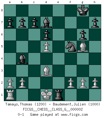 Last move : 0-1 2006 June 15 21:53:16 [Event "FICGS__CHESS__CLASS_G__000002"] [Site "FICGS"] [Date "2006.06.07"] [Round "1"] [White "Tamayo,Thomas"] [Black "Baudement,Julien"] [Result "0-1"] [WhiteElo "1200"] [BlackElo "1000"] 1.e4 e5 2.d3 Nc6 3.Nf3 Bc5 4.Be3 d6 5.d4 exd4 6.Ng5 Qe7 7.Bf4 f6 8.c3 fxg5 9.Qh5+ g6 10.Qxg5 Qxg5 11.Bxg5 dxc3 12.Nxc3 Nge7 13.Nd5 Nxd5 14.exd5 Bb4+ 15.Kd1 Nd4 16.Bd3 O-O 17.Be3 Nf5 18.Bg5 Re8 19.Re1 Bd7 20.Re4 Rxe4 21.Bxe4 Re8 22.Bd3 Re1+ 0-1 Variation Indian Opening : Indian Opening Kingside Castling by player Black (move 16) Player Black won this chess game. Follow this game move after move (download)Fischer is completely natural. He plays no roles. He's like a child. Very, very simple. (Zita Rajcsanyi) Die Leute spielen gegen mich seit 15 Jahren unter Ihren Möglichkeiten. (Robert James Fischer) Fischer no está bajo la obligación de nadie. (Joseph Platz) Les échecs, c'est la lutte contre l'erreur. (Johannes Zukertort) At work, the authority of a person is inversely proportional to the number of pens that person is carrying. (Dan Rotaru)