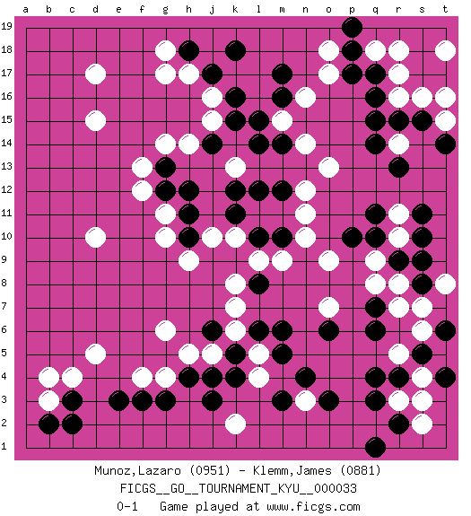 Last move : 0-1 2007 October 3 11:4:56 [Event "FICGS__GO__TOURNAMENT_KYU__000033"] [Site "FICGS"] [Date "2007.05.15"] [Round "1"] [Black "Munoz,Lazaro"] [White "Klemm,James"] [Result "0-1"] [Rating 1 "0951"] [Rating 2 "0881"] 1.q16 d17 2.q4 c4 3.e3 d5 4.q10 o17 5.m17 r17 6.q17 q18 7.p18 r18 8.p17 r16 9.q15 r14 10.q14 g4 11.j3 d15 12.j17 d10 13.r13 k10 14.r15 s16 15.n4 o9 16.q7 n14 17.l14 o18 18.p19 n16 19.m16 m15 20.l15 n12 21.m14 o13 22.l12 m9 23.g3 g17 24.s15 t18 25.h4 h14 26.h18 q9 27.r9 r10 28.p10 r8 29.s9 q8 30.s8 r7 31.q6 s7 32.s10 f4 33.f3 r3 34.q3 s4 35.c3 b3 36.c2 g6 37.h12 f13 38.j6 l4 39.m5 n3 40.o3 k2 41.m3 k6 42.k5 l5 43.l6 k7 44.m6 j5 45.k4 h5 46.j4 g11 47.h11 g10 48.r2 s2 49.r4 s3 50.q1 r11 51.q11 o7 52.o6 k13 53.m12 n11 54.l10 l9 55.m10 n10 56.k11 j10 57.k12 g18 58.h10 h9 59.g12 f12 60.b2 j16 61.k16 h17 62.k18 b4 63.g13 g14 64.j14 j15 65.k15 t8 66.s11 t15 67.t14 t16 68.l8 k8 69.s5 t5 70.t6 r5 71.t4 s6 0-1 This go game has been lost on time (started : 2007.05.15 19:42:59) Here are the names of the openings (joseki) played in the four corners : Corner d4 : c4 e3 Komoku (Somok, Xiao~mu`) 3-4 Point. The komoku (3-4) point is the traditional corner enclosure move.. Ikken Kakari (Hankan Keolch'im, Yi Gua`jiao~, 1-Space Low Pincer). The small knight move is the basic approach move to the 3-4 point stone. It has been continually used for over four centuries. There are limitless variations, with new moves constantly being discovered. Black 2 opens the door to a treaure store of joseki. Corner q16 : q16 o17 Hoshi (Hwajeom, Seongjeom, Xingwei`) 4-4 Point. The star or hoshi (4-4) point, emphasizing influence at the potential expense of territory. Ikken Kakari (Hankan Keolch'im, Yi Gua`jiao~, 1-Space Low Approach). White 2 is the standard approach move to the 4-4. Player White won this Go (weiqi, baduk) game. Follow this game move after move (download)Five liberties for tactical stability. (Anonymous) In my experience, there's no such thing as luck. (Obi-Wan Kenobi in Star Wars ep.4)