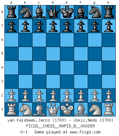 Last move : 0-1 2018 August 24 22:55:15 [Event "FICGS__CHESS__RAPID_B__000289"] [Site "FICGS"] [Date "2018.07.25"] [Round "1"] [White "van Kalsbeek,Jacco"] [Black "Jokic,Nedo"] [Result "0-1"] [WhiteElo "1700"] [BlackElo "1700"] 0-1 This chess game has been lost on time (started : 2018.07.25 11:59:30) Player Black won this chess game. Follow this game move after move (download)Up to this point White has been following well-known analysis. But now he makes a fatal error: he begins to use his own head. (Siegbert Tarrasch) Ich würde mich als ganz normalen Jungen bezeichnen [Im Alter von 12]. (Sergej Karjakin) Para mi, el Ajedrez es la vida y cada partida es como una nueva vida. Todo jugador de Ajedrez suele vivir muchas vidas durante su vida. (Eduard Gufeld) Même un GMI sait rarement calculer sur plus de cinq coups une attaque à sacrifices. (Rudolf Spielmann) Everything in life is luck. (Donald Trump)