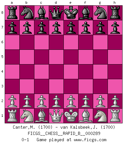 Last move : 0-1 2018 August 24 22:55:15 [Event "FICGS__CHESS__RAPID_B__000289"] [Site "FICGS"] [Date "2018.07.25"] [Round "1"] [White "Canter,Michelle"] [Black "van Kalsbeek,Jacco"] [Result "0-1"] [WhiteElo "1700"] [BlackElo "1700"] 0-1 This chess game has been lost on time (started : 2018.07.25 11:59:30) Player Black won this chess game. Follow this game move after move (download)Different people feel differently about resigning. (Bobby Fischer) Ohne ihre Erfolge schmälern zu wollen würde ich sagen Petrosian, Spassky und Karpov verdanken ihre Siege ihren Trainern - Boleslavsky, Bondarevsky und Furman. (Mikhail Moiseyevich Botvinik) El ganador de una partida es aquel jugador que hace el penúltimo error. (Savielly Tartakover) Un footballeur joue avec ses pieds, parfois avec sa tête. Un joueur d'échecs ne joue qu'avec sa tête. Et quand il ne joue plus, il meurt. (Jacob Murray) Thus, what is of supreme importance in war is to attack the enemy's strategy. (Sun Tzu)