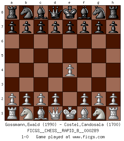 Last move : 1-0 2018 August 24 22:55:15 [Event "FICGS__CHESS__RAPID_B__000289"] [Site "FICGS"] [Date "2018.07.25"] [Round "1"] [White "Gossmann,Ewald"] [Black "Costel,Candosala"] [Result "1-0"] [WhiteElo "1990"] [BlackElo "1700"] 1.e4 1-0 This chess game has been lost on time (started : 2018.07.25 11:59:30) King's pawn Opening Player White won this chess game. Follow this game move after move (download)Even the laziest King flees wildly in the face of a double check ! (Aaron Nimzowitsch) Du musst nicht gut spielen, es reicht, wenn du besser spielst als dein Gegner. (Anonymous) Todos los Maestros de Ajedrez fueron un día unos principiantes. (Chernev) Les Echecs ne sont pas pour les âmes timides. Ils requièrent un homme entier, qui ne s'arrête pas aveuglément à ce qui a été déjà établi, mais qui tente individuellement de sonder les profondeurs du jeu. (W. Steinitz) I believe in luck. How else can you explain the success of those you dislike ? (Jean Cocteau)