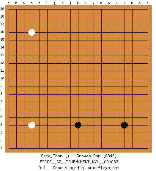 Last move : 0-1 2007 May 18 11:27:55 [Event "FICGS__GO__TOURNAMENT_KYU__000033"] [Site "FICGS"] [Date "2007.05.15"] [Round "1"] [Black "Serd,Than"] [White "Groves,Don"] [Result "0-1"] [Rating 2 "0846"] 1.q4 d4 2.k4 d16 0-1 Here are the names of the openings (joseki) played in the four corners : Corner d4 : d4 0-1 Hoshi (Hwajeom, Seongjeom, Xingwei`) 4-4 Point. The star or hoshi (4-4) point, emphasizing influence at the potential expense of territory. Player White won this Go (weiqi, baduk) game. Follow this game move after move (download)The second line is the line of defeat, the third line is the line of territory, and the fourth line is the line of influence. (Anonymous) I just play for fun. (Anna Kournikova)