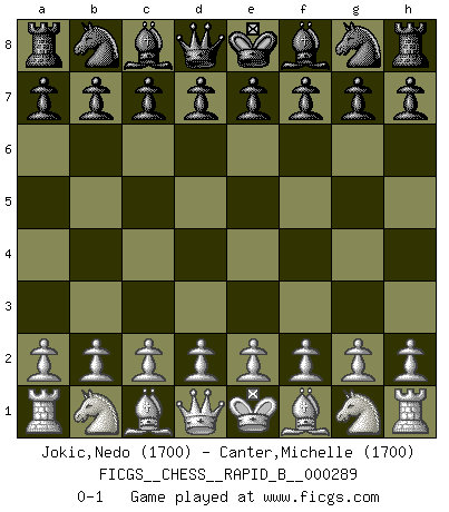 Last move : 0-1 2018 August 24 22:55:15 [Event "FICGS__CHESS__RAPID_B__000289"] [Site "FICGS"] [Date "2018.07.25"] [Round "1"] [White "Jokic,Nedo"] [Black "Canter,Michelle"] [Result "0-1"] [WhiteElo "1700"] [BlackElo "1700"] 0-1 This chess game has been lost on time (started : 2018.07.25 11:59:30) Player Black won this chess game. Follow this game move after move (download)Chess is a matter of delicate judgment, knowing when to punch and how to duck. (Bobby Fischer) Das Schach ist nichts für kleine Geister, es beansprucht einen vollen Mann, der sich nicht sklavisch an das Überlieferte hält, sondern selbständig die Tiefen des Spiels zu ergründen sucht. (Wilhelm Steinitz) Realmente no sabemos como el juego fue inventado, aunque hay sospechas. Tan pronto como descubramos a los culpables, se los haremos saber. (Bruce Pandolfini) Avec des compensations pour le matériel en plus... (Anonyme) A belief is an idea the mind possesses, an idea that possesses the mind. (Robert Oxden Bolton)