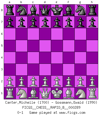 Last move : 0-1 2018 August 24 22:55:15 [Event "FICGS__CHESS__RAPID_B__000289"] [Site "FICGS"] [Date "2018.07.25"] [Round "1"] [White "Canter,Michelle"] [Black "Gossmann,Ewald"] [Result "0-1"] [WhiteElo "1700"] [BlackElo "1990"] 0-1 This chess game has been lost on time (started : 2018.07.25 11:59:30) Player Black won this chess game. Follow this game move after move (download)Live, lose, and learn, by observing your opponent how to win. (Amber Steenbock) Die Jungen erwarten, dass Opa einfach umfällt. Dann aber kann Opa fünf Stunden lang Schach spielen und die jungen Gegner an die Wand drücken. (Viktor Kortschnoi) Aún deseo matar a Fischer. (Boris Spassky) Le jeu d'échecs est comme rejeté hors du temps. (Antoine de Saint-Exupéry) Opportunities multiply as they are seized. (Sun Tzu)