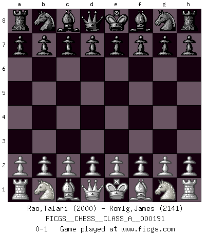 Last move : 0-1 2018 September 4 11:45:12 [Event "FICGS__CHESS__CLASS_A__000191"] [Site "FICGS"] [Date "2018.07.26"] [Round "1"] [White "Rao,Talari"] [Black "Romig,James"] [Result "0-1"] [WhiteElo "2000"] [BlackElo "2141"] 0-1 This chess game has been lost on time (started : 2018.07.26 3:18:59) Player Black won this chess game. Follow this game move after move (download)By this measure (on the gap between Fischer & his contemporaries), I consider him the greatest world champion. (Garry Kasparov) Wer mein Gambit spielt, muß bereit sein, alle Brücken hinter sich abzubrechen. Es verändert den ganzen Menschen. Es wirkt wie ein Zauberstab und fördert verkümmerte, gute Charakter- eigenschaften wieder zu Tage. (Emil Joseph Diemer) La batalla por la última verdad nunca sera ganada. Y es por eso que el Ajedrez es tan fascinante. (Hans Kmoch) En blitz, le Cavalier l'emporte sur le Fou. (Vlastimil Hort) The best teachers teach from the heart, not from the book. (Author unknown)