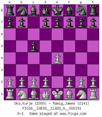 Last move : 0-1 2018 September 4 11:45:12 [Event "FICGS__CHESS__CLASS_A__000191"] [Site "FICGS"] [Date "2018.07.26"] [Round "1"] [White "Oko,Kurje"] [Black "Romig,James"] [Result "0-1"] [WhiteElo "2000"] [BlackElo "2141"] 1.e4 c5 0-1 This chess game has been lost on time (started : 2018.07.26 3:18:59) Sicilian defense Player Black won this chess game. Follow this game move after move (download)Of Chess it has been said that life is not long enough for it, but that is the fault of life, not Chess. (William Ewart Napier) Im Schach gewinnt jeder. Hat man Freunde am Spiel - und das ist die Hauptsache - ist auch der Verlust einer Partie kein Unglück. (David Bronstein) Una partida de Ajedrez se divide en 3 etapas: la primera cuando piensas que tienes la ventaja, la segunda cuando crees que tienes la ventaja y la tercera... ¡cuando te das cuenta que vas a perder!. (Savielly Tartakower) Aux échecs, l'amour-propre est satisfait quand on remporte la victoire, mais il n'y a pas de honte à être battu. (Benjamin Franklin) The only thing that matters is the evidence. (Horatio Caine, C.S.I. Miami)