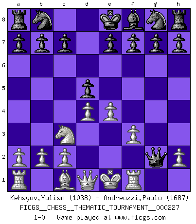 Last move : 1-0 2018 September 13 12:42:53 [Event "FICGS__CHESS__THEMATIC_TOURNAMENT__000227"] [Site "FICGS"] [Date "2018.07.28"] [Round "1"] [White "Kehayov,Yulian"] [Black "Andreozzi,Paolo"] [Result "1-0"] [WhiteElo "1038"] [BlackElo "1687"] 1.d4 d5 2.g4 Bxg4 3.f3 Bf5 4.Bh3 Qd7 5.Nc3 Bxh3 6.Nxh3 Qxh3 7.e4 Qg2 8.Rf1 1-0 This chess game has been lost on time (started : 2018.07.28 23:24:47) Queen's pawn game Player White won this chess game. Follow this game move after move (download)Chess is the art of analysis. (Mikhail Botvinnik) Kein Schachspieler kann gut schlafen. (H. G. Wells) Un Peón pasado aumenta su poder a medida de que el número de piezas en el tablero disminuye. (Capablanca) Karpov est une pièce de musée. (Garry Kasparov) Life is like internet, nothing interesting, but noone want to leave it. (Ilmars Cirulis)