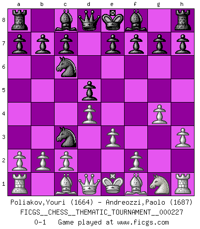 Last move : 0-1 2018 August 2 18:15:14 [Event "FICGS__CHESS__THEMATIC_TOURNAMENT__000227"] [Site "FICGS"] [Date "2018.07.28"] [Round "1"] [White "Poliakov,Youri"] [Black "Andreozzi,Paolo"] [Result "0-1"] [WhiteElo "1664"] [BlackElo "1687"] 1.d4 d5 2.g4 Nc6 3.e3 Nf6 4.h3 Ne4 5.Nc3 Nxc3 0-1 Queen's pawn game Player Black won this chess game. Follow this game move after move (download)Bobby Fischer is the greatest Chess genius of all time ! (Alexander Kotov) Charakterschwächen offenbaren sich normalerweise während einer Schachpartie. (Garry Kasparov) Me siento como si fuera una pieza en una partida de Ajedrez, cuando mi oponente me indica: esa pieza no puede ser movida. (Soren Kierkegaard) Les Echecs représentent une sphère d'idées créatrices basée sur la volonté des deux protagonistes. (Smyslov) The faster the computer, the slower the brain. (Thibault de Vassal)