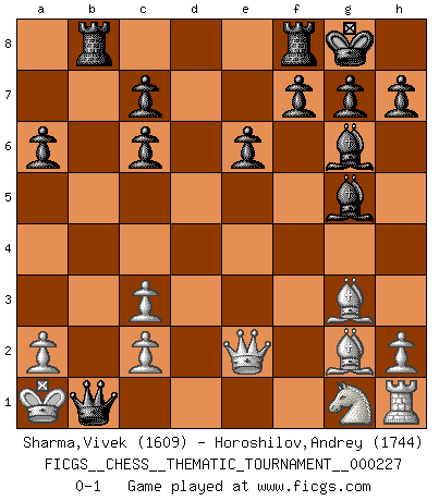 Last move : 0-1 2018 August 2 10:59:49 [Event "FICGS__CHESS__THEMATIC_TOURNAMENT__000227"] [Site "FICGS"] [Date "2018.07.28"] [Round "1"] [White "Sharma,Vivek"] [Black "Horoshilov,Andrey"] [Result "0-1"] [WhiteElo "1609"] [BlackElo "1744"] 1.d4 d5 2.g4 Bxg4 3.Nc3 Nf6 4.Bf4 e6 5.Qd3 Nc6 6.O-O-O Be7 7.f3 Bf5 8.e4 dxe4 9.fxe4 Bg6 10.Qb5 Qc8 11.d5 Nxe4 12.Bg3 Bg5+ 13.Kb1 Nxc3+ 14.bxc3 a6 15.Qe2 O-O 16.dxc6 bxc6 17.Bg2 Qb7+ 18.Ka1 Rab8 19.Rb1 Qxb1+ 0-1 Queen's pawn game Queenside Castling by player White (move 6) Kingside Castling by player Black (move 15) Player Black won this chess game. Follow this game move after move (download)A Chess game is a dialogue, a conversation between a player and his opponent. Each move by the opponent may contain threats or be a blunder, but a player cannot defend against threats or take advantage of blunders if he does not first ask himself: What is my opponent planning after each move ? (Bruce A. Moon) Mein Gehirn das ist mein zweitwichtigstes Organ [Aus dem Film: Der Schläfer]. (Woody Allen) La maestría del Ajedrez consiste esencialmente en analizar posiciónes de Ajedrez con precisión. (Mikhail Botvinnik) Comme les marins qui ont mille raisons différentes d'aller en mer, les joueurs d'échecs en ont tout autant avant de s'installer devant une table et jouer... (Vincent Bertignac, philosophe) A married woman is like a fish riding a bicycle. (Rodolfo d'Ettorre)