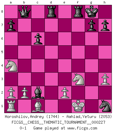 Last move : 0-1 2018 September 26 21:53:13 [Event "FICGS__CHESS__THEMATIC_TOURNAMENT__000227"] [Site "FICGS"] [Date "2018.07.28"] [Round "1"] [White "Horoshilov,Andrey"] [Black "Aahlad,Yeturu"] [Result "0-1"] [WhiteElo "1744"] [BlackElo "2053"] 1.d4 d5 2.g4 Bxg4 3.h3 Bh5 4.Bg2 e6 5.Qd3 c5 6.dxc5 Bxc5 7.c4 Qb6 8.cxd5 Bxf2+ 9.Kf1 Nf6 10.dxe6 Nc6 11.exf7+ Bxf7 12.Nc3 Rd8 13.Bxc6+ bxc6 14.Qc2 O-O 15.Na4 Qb8 16.Nf3 Nh5 17.Ng5 Ng3+ 18.Kxf2 Nxh1+ 19.Kf1 Bb3 20.Nf3 Bxc2 0-1 Queen's pawn game Kingside Castling by player Black (move 14) Player Black won this chess game. Follow this game move after move (download)Morphy was probably the greatest genius of them all. (Bobby Fischer) Es ist im Leben wie im Schachspiel. Wir entwerfen einen Plan, dieser bleibt jedoch bedingt durch das, was im Schachspiel dem Gegner, im Leben dem Schicksal zu tun belieben wird. (Arthur Schopenhauer) El Ajedrez es una hermosa aventura. (Bent Larsen) J'apprécie les joueurs d'est-indienne, c'est grâce à eux que je nourris ma famille depuis tant d'années. (Petrosian) The ego is not master in its own house. (Sigmund Freud)