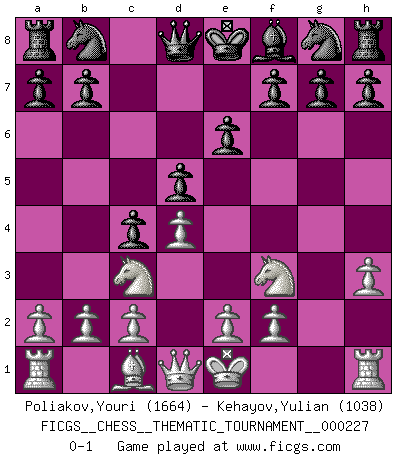 Last move : 0-1 2018 August 2 1:43:51 [Event "FICGS__CHESS__THEMATIC_TOURNAMENT__000227"] [Site "FICGS"] [Date "2018.07.28"] [Round "1"] [White "Poliakov,Youri"] [Black "Kehayov,Yulian"] [Result "0-1"] [WhiteElo "1664"] [BlackElo "1038"] 1.d4 d5 2.g4 Bxg4 3.h3 Bh5 4.Nc3 e6 5.Bg2 c5 6.Bf3 Bxf3 7.Nxf3 c4 0-1 Queen's pawn game Player Black won this chess game. Follow this game move after move (download)Weak points or holes in the opponent's position must be occupied by pieces not Pawns. (Siegbert Tarrasch) Jeder weiß, dass Gasprom Putins persönliches Machtinstrument ist. Die Firma wird vom Kreml aus geleitet und wird schon deshalb nie transparent sein. (Garry Kasparov) Un jugador que trata de regresar una movida en el Ajedrez es un futuro carterista. (Richard Fenton) Le thème de l'attaque double intervient d'une manière ou d'une autre dans l'immense majorité des combinaisons. (Youri Averbakh) There is a computer disease that anybody who works with computers knows about. It's a very serious disease and it interferes completely with the work. The trouble with computers is that you 'play' with them ! (Richard P. Feynman)