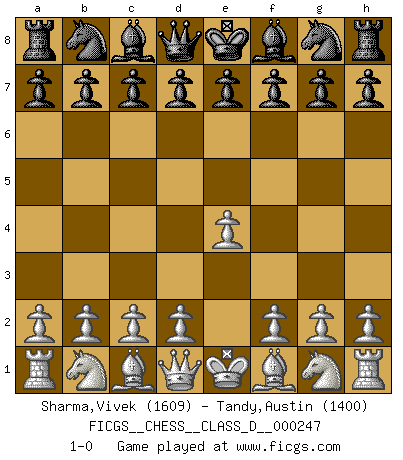 Last move : 1-0 2018 September 8 12:6:13 [Event "FICGS__CHESS__CLASS_D__000247"] [Site "FICGS"] [Date "2018.07.29"] [Round "1"] [White "Sharma,Vivek"] [Black "Tandy,Austin"] [Result "1-0"] [WhiteElo "1609"] [BlackElo "1400"] 1.e4 1-0 This chess game has been lost on time (started : 2018.07.29 21:26:37) King's pawn Opening Player White won this chess game. Follow this game move after move (download)You have to have the fighting spirit. You have to force moves and take chances. (Bobby Fischer) Matt entspricht nicht immer den Tatsachen. (Savielly Grigorievitsch Tartakower) Las piezas de Ajedrez son los bloques del alfabeto que moldean los pensamientos; y esos pensamientos, aunque hagan un diseño visual en el tablero, expresan abstractamente su belleza como un poema. (Marcel Duchamp) Même si l'adversaire joue le coup analysé précédemment, recommencez l'analyse en voyant la nouvelle position. Première règle de Blumenfeld However beautiful the strategy, you should occasionally look at the results. (Winston Churchill)