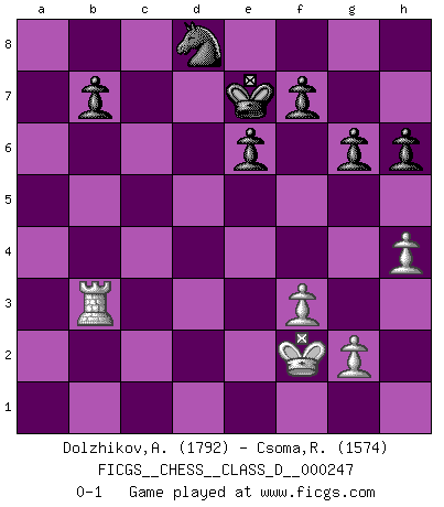 Last move : 0-1 2018 December 10 0:55:57 [Event "FICGS__CHESS__CLASS_D__000247"] [Site "FICGS"] [Date "2018.07.29"] [Round "1"] [White "Dolzhikov,Aleksandr"] [Black "Csoma,Robert"] [Result "0-1"] [WhiteElo "1792"] [BlackElo "1574"] 1.d4 Nf6 2.c4 d5 3.cxd5 Nxd5 4.e4 Nf6 5.Nc3 e6 6.f3 c5 7.Bb5+ Bd7 8.Bg5 Be7 9.Bxd7+ Nbxd7 10.Nge2 O-O 11.O-O h6 12.Bh4 cxd4 13.Nxd4 Rc8 14.Rc1 Qb6 15.Bf2 Qxb2 16.Rc2 Qa3 17.Ndb5 Qa5 18.Be1 a6 19.e5 axb5 20.exf6 Nxf6 21.Nd5 Qd8 22.Rxc8 Qxd5 23.Qc2 Rxc8 24.Qxc8+ Kh7 25.Qc2+ g6 26.Bf2 b4 27.Rd1 Qc6 28.Rc1 Qa6 29.Qc7 Nd5 30.Qe5 Qxa2 31.Qa1 b3 32.Bd4 Qxa1 33.Rxa1 Nb4 34.Rb1 Nc6 35.Bb6 Bd8 36.Bxd8 Nxd8 37.Rxb3 Kg7 38.Kf2 Kf6 39.h4 Ke7 0-1 Queen's pawn game Kingside Castling by player Black (move 10) Kingside Castling by player White (move 11) Player Black won this chess game. Follow this game move after move (download)In complicated positions, Bobby Fischer hardly had to be afraid of anybody. (Paul Keres) Es ist wirklich schade, dass so viele Schachspieler nicht auf ihr Äußeres achten! (Alexandra Kosteniuk) El Ajedrez es un regaderazo frío para la mente. (Sir John Simon) D'abord les bases : Jouez et étudiez, puis étudiez et jouez, ensuite jouez et étudiez, puis étudiez et jouez. Deuxièmement : Donnez toujours le meilleur de vous-même ! (Ken Smith) Computer Science is no more about computers than astronomy is about telescopes. (Edsger W. Dijkstra)