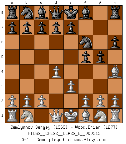 Last move : 0-1 2018 September 12 0:21:7 [Event "FICGS__CHESS__CLASS_E__000212"] [Site "FICGS"] [Date "2018.07.29"] [Round "1"] [White "Zemlyanov,Sergey"] [Black "Wood,Brian"] [Result "0-1"] [WhiteElo "1363"] [BlackElo "1277"] 1.d4 f5 2.Bg5 h6 3.Bh4 g5 4.e3 Nf6 0-1 This chess game has been lost on time (started : 2018.07.29 23:5:39) Dutch, 2.Bg5 variation Player Black won this chess game. Follow this game move after move (download)The game of Chess is not merely an idle amusement; several very valuable qualities of the mind are to be acquired and strengthened by it, so as to become habits ready on all occasions; for life is a kind of Chess. (Benjamin Franklin) Obendrein hat der FIDE-Präsident den Revolutionsführer Gaddafi zum »Großmeister« ernannt, am Ende der WM. Das ist lächerlich! (Joel Lautier) Botvinnik trató de alejar el misterio referente al Ajedrez, siempre relacionandolo a situaciones de la vida diaria. Solía llamar al Ajedrez un problema inexacto típico, similar a aquellos en que la gente tiene siempre que resolver a cada día. (Garry Kasparov) Il (Jacob Murray) ne joue pas pour le bon coup, mais pour le meilleur. (Eloi Relange) Two beer, or not two beer. (Unknown)