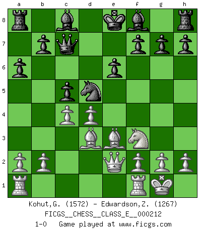Last move : 1-0 2019 January 9 4:32:0 [Event "FICGS__CHESS__CLASS_E__000212"] [Site "FICGS"] [Date "2018.07.29"] [Round "1"] [White "Kohut,Gregory"] [Black "Edwardson,Zachariah"] [Result "1-0"] [WhiteElo "1572"] [BlackElo "1267"] 1.e4 e6 2.d4 d5 3.Nc3 dxe4 4.Nxe4 Nd7 5.Nf3 Ngf6 6.Bd3 Nxe4 7.Bxe4 Nf6 8.Bd3 c5 9.Be3 Qc7 10.Qe2 a6 11.O-O Nd5 12.c4 1-0 French : Rubinstein variation Kingside Castling by player White (move 11) Player White won this chess game. Follow this game move after move (download)In Fischer's hands, a slight theoretical advantage is as good a being a Queen ahead. (Isaac Kashdan) Über die Verhaftung Bobby Fischers: Warum es die Bush-Administration für nötig befindet einen 61 Jahre alten Mann zu hetzten, der für niemanden ausser sich selbste eine Gefahr darstellt ist ein Rätsel. (Nigel Short) Los Peones son nacidos libres, y aún así, se encuentran por doquier encadenados. (Rick Kennedy) Même si l'adversaire joue le coup analysé précédemment, recommencez l'analyse en voyant la nouvelle position. Première règle de Blumenfeld Beta. Software undergoes beta testing shortly before it's released. Beta is latin for still doesn't work. (Anonymous)