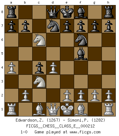 Last move : 1-0 2018 October 15 8:44:53 [Event "FICGS__CHESS__CLASS_E__000212"] [Site "FICGS"] [Date "2018.07.29"] [Round "1"] [White "Edwardson,Zachariah"] [Black "Simoni,Patucci"] [Result "1-0"] [WhiteElo "1267"] [BlackElo "1282"] 1.d4 d5 2.c4 c6 3.Nf3 Nf6 4.Nc3 dxc4 5.a4 Bf5 6.Ne5 Nbd7 7.Nxc6 1-0 This chess game has been lost on time (started : 2018.07.29 23:5:39) QGD Slav : Krause attack Player White won this chess game. Follow this game move after move (download)You can only get good at Chess if you love the game. (Bobby Fischer) Schach ist ein Reich, wo sich die menschliche Phantasie frei entfalten kann. (David Bronstein) El Ajedrez lo es todo: arte, ciencia y deporte. (Anatoly Karpov) Même si vous avez un bon coup à faire, regardez toujours s'il n'y en a pas un qui lui soit préférable. (Pedro Damiano) Drag your thoughts away from your troubles... by the ears, by the heels, or any other way you can manage it. (Mark Twain)