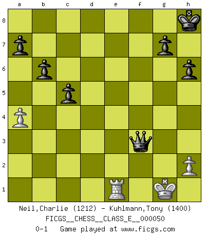 Last move : 0-1 2007 July 19 18:59:24 [Event "FICGS__CHESS__CLASS_E__000050"] [Site "FICGS"] [Date "2007.05.16"] [Round "1"] [White "Neil,Charlie"] [Black "Kuhlmann,Tony"] [Result "0-1"] [WhiteElo "1212"] [BlackElo "1400"] 1.d4 Nf6 2.c4 e6 3.Nf3 Bb4+ 4.Nbd2 b6 5.a3 Bxd2+ 6.Bxd2 O-O 7.e3 Bb7 8.Bd3 Ne4 9.O-O Nxd2 10.Nxd2 f5 11.Re1 Qf6 12.Qe2 c5 13.Nb3 d6 14.f3 Nc6 15.d5 exd5 16.cxd5 Ne5 17.e4 Nxd3 18.Qxd3 fxe4 19.fxe4 Qxb2 20.Nd2 Qf6 21.Rf1 Qe5 22.Nc4 Qe7 23.Qg3 Qxe4 24.Nxd6 Qxd5 25.Nxb7 Qxb7 26.a4 Rxf1+ 27.Kxf1 Qe4 28.Qb3+ Kh8 29.Re1 Rf8+ 30.Qf3 Rxf3+ 31.gxf3 Qxf3+ 32.Kg1 h6 0-1 Bogo-Indian defense, Gruenfeld variation Kingside Castling by player Black (move 6) Kingside Castling by player White (move 9) Player Black won this chess game. Follow this game move after move (download)Play the opening like a book, the middle game like a magician, and the endgame like a machine. (Spielmann) Die Partien sind immer verschieden, die Interviews immer die gleichen. (Garry Kasparov) El hombre es un frívolo, una creatura engañosa y como un jugador de Ajedrez, se preocupa mas por el proceso de obtener su meta que de la meta por sí misma. (Dostoyevsky) Les ravages du H expliquent la différence de niveau entre Tal et Thal [Abergel]. I take risks, sometimes patients die, but not taking risks causes more patients to die. So I guess my biggest problem is I've been cursed with the ability to do the math. (Gregory House, House M.D.)