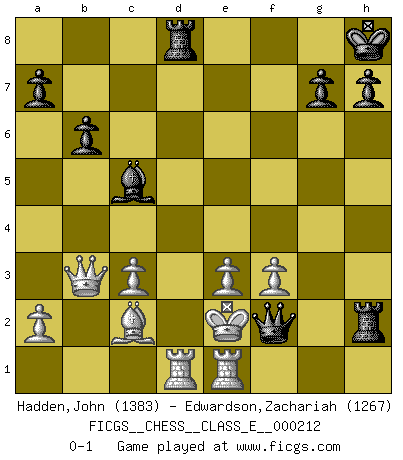 Last move : 0-1 2018 October 7 4:31:50 [Event "FICGS__CHESS__CLASS_E__000212"] [Site "FICGS"] [Date "2018.07.29"] [Round "1"] [White "Hadden,John"] [Black "Edwardson,Zachariah"] [Result "0-1"] [WhiteElo "1383"] [BlackElo "1267"] 1.d4 f5 2.Nf3 Nf6 3.Nc3 d5 4.Bf4 c6 5.e3 e6 6.Bd3 Be7 7.O-O O-O 8.Bxb8 Rxb8 9.Ne2 b6 10.c4 c5 11.cxd5 Nxd5 12.Nc3 Bb7 13.dxc5 Nxc3 14.bxc3 Bxf3 15.gxf3 Bxc5 16.Bc4 Qe7 17.Re1 Rf6 18.Qb3 Rh6 19.Kf1 Rxh2 20.Bxe6+ Kh8 21.Bxf5 Qg5 22.Bc2 Rd8 23.Rad1 Qg2+ 24.Ke2 Qxf2+ 0-1 Dutch Kingside Castling by player White (move 7) Kingside Castling by player Black (move 7) Player Black won this chess game. Follow this game move after move (download)The stomach is an essential part of the Chess master. (Bent Larsen) Drei Punkte vor allen anderen ist wie einer, der im weißen Anzug posiert, während der Rest in Müllsäcke gekleidet dasteht. (Viktor Kortschnoi) Ayuda a tus piezas para que ellas te puedan ayudar. (Paul Morphy) Le plus grand jeu de l'esprit jamais inventé, plus vous l'apprenez, plus vous y prenez du plaisir. (Garry Kasparov) How many people work in NATO Headquarters ? - About half of them. (Dirk Stikker, NATO general secretary)