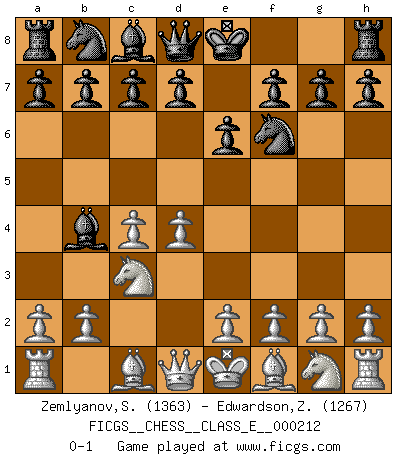 Last move : 0-1 2018 September 12 12:36:23 [Event "FICGS__CHESS__CLASS_E__000212"] [Site "FICGS"] [Date "2018.07.29"] [Round "1"] [White "Zemlyanov,Sergey"] [Black "Edwardson,Zachariah"] [Result "0-1"] [WhiteElo "1363"] [BlackElo "1267"] 1.d4 Nf6 2.c4 e6 3.Nc3 Bb4 0-1 This chess game has been lost on time (started : 2018.07.29 23:5:39) Nimzo-Indian defense Player Black won this chess game. Follow this game move after move (download)Excellence at Chess is one mark of a scheming mind. (Sir Arthur Conan Doyle) Jeder Fehler erscheint unglaublich dumm, wenn andre ihn begehen. (Georg Christoph Lichtenberg) Coloca el contenido del tablero de Ajedrez en un sombrero, agita las piezas vigorosamente, derrámalas en el tablero desde una altura de medio metro y así obtienes el estilo de Wilhelm Steinitz. (H. E. Bird) Les échecs sont utiles à l'exercice de la faculté de penser et à celle de l'imagination. Car nous devons posséder une méthode élaborée pour atteindre des buts partout où nous devons conduire notre raison. (Leibnitz) Always be a first-rate version of yourself, instead of a second-rate version of somebody else. (Judy Garland)