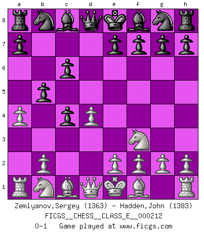 Last move : 0-1 2018 September 9 12:11:31 [Event "FICGS__CHESS__CLASS_E__000212"] [Site "FICGS"] [Date "2018.07.29"] [Round "1"] [White "Zemlyanov,Sergey"] [Black "Hadden,John"] [Result "0-1"] [WhiteElo "1363"] [BlackElo "1383"] 1.d4 d5 2.c4 dxc4 3.Nf3 b5 4.a4 c6 0-1 This chess game has been lost on time (started : 2018.07.29 23:5:39) QGA : Ericson variation Player Black won this chess game. Follow this game move after move (download)I'm not a materialistic person, in that, I don't suffer the lack or loss of money. The absence of worldly goods I don't look back on. For Chess is a way I can be as materialistic as I want without having to sell my soul. (Jamie Walter Adams) Wenn ich einen Club besuche, sind die Spieler stumm vor Staunen. (José Raúl Capablanca) Un mal plan es mejor que no tener ningún plan. (Frank Marshall) D'abord les bases : Jouez et étudiez, puis étudiez et jouez, ensuite jouez et étudiez, puis étudiez et jouez. Deuxièmement : Donnez toujours le meilleur de vous-même ! (Ken Smith) Hello Thibault, if I have had a plan (and I had one, I hope), I have forgotten it during the last week... - Hello Heinz-Georg. What do you mean a plan ? (Anonymous players, during a Big Chess game)